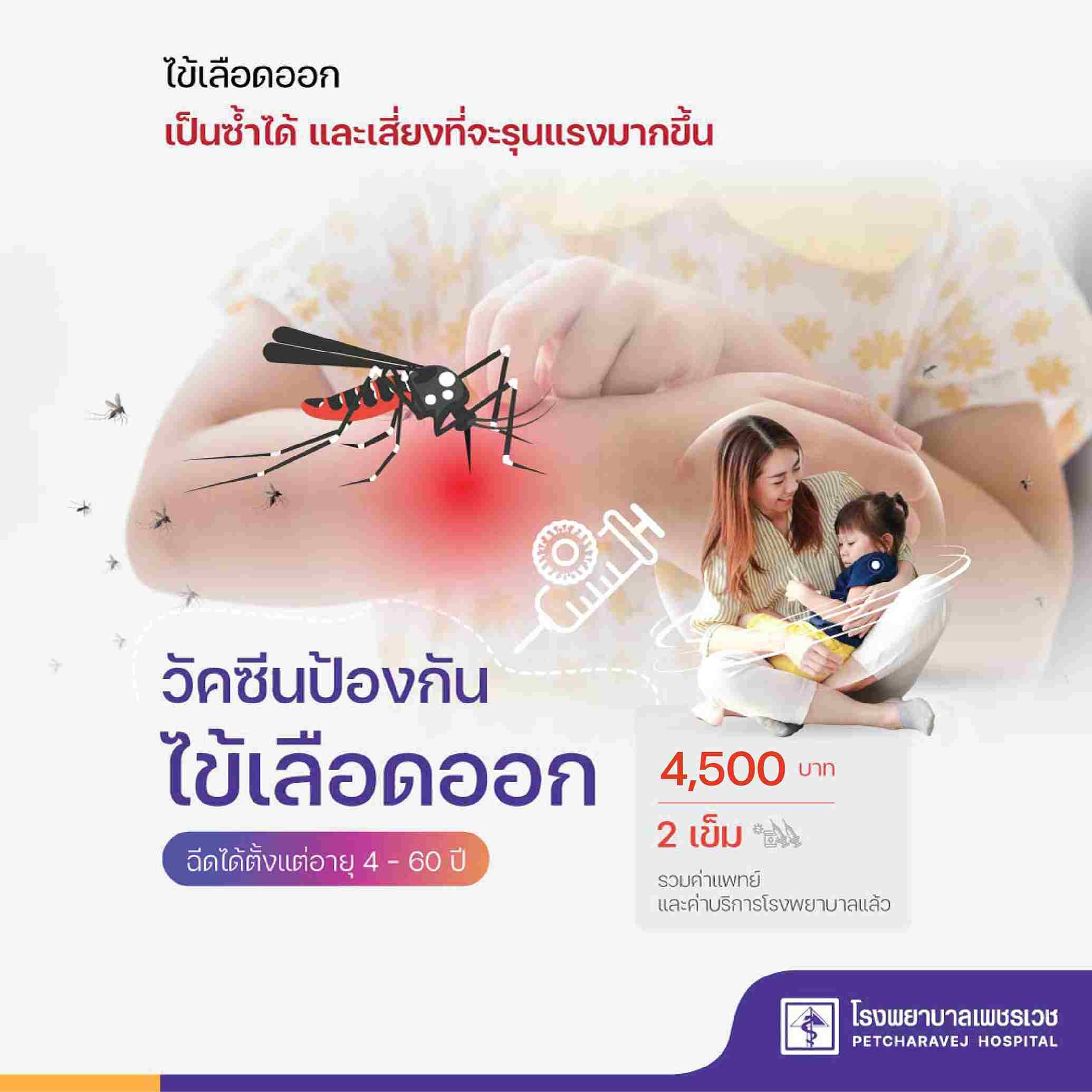 ไข้เลือดออก เป็นโรคอันตรายที่เสี่ยงจะรุนแรงขึ้น ถ้าหากติดซ้ำ ป้องกันได้โดยการฉีดวัคซีนป้องกันไข้เลือดออก ในราคาสุดคุ้มค่า 2 เข็มเพียง 4,500 บาท สามารถฉีดได้ตั้งแต่อายุ 4 - 60 ปี เพิ่มความสุข ลดความเสี่ยง เพียงฉีดวัคซีนป้องกันไข้เลือดออก