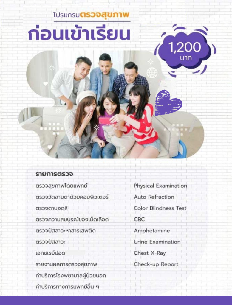 เพราะช่วงชีวิตในวัยเรียนนั้นสำคัญ เริ่มต้นชีวิตวัยเรียนด้วยการตรวจสุขภาพก่อนเข้าเรียนในราคา 1200 บาท ราคาเดียวไม่มีค่าใช้จ่ายเพิ่มเติม